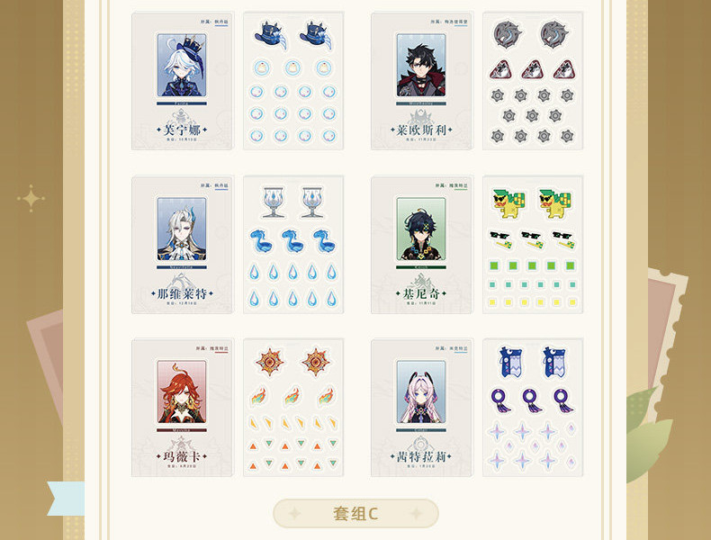 | キャラクター | ディルック、ウェンティ、エウルア、胡桃、魈、鍾離、八重神子、楓原万葉、雷電将軍、アルハイゼン、放浪者、ナヒーダ、フリーナ、リオセスリ、ヌヴィレット、キィニチ、マーヴィカ、シトラリ |